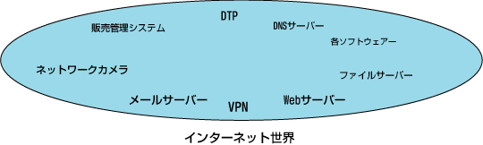 それとは別に、考えなければならないのは、営業がインターネットを使う場合には、まったく違う視野で見ていただきたいと言うことです。 図-1のイラストを見て、なんやこれ?と思う方もいるとおもいますが。インターネットの世界に販売管理システム、ホームページ(Webサーバ)、電子メール、ファックス、携帯電話、各ソフトウェアー、VPN、グループウェアー、DTPが混在しております。